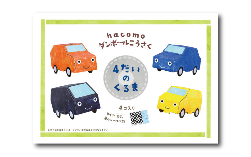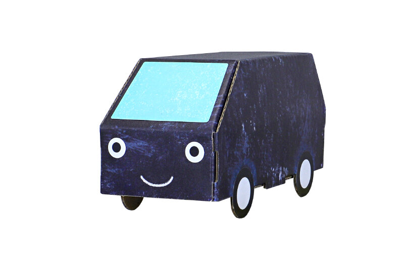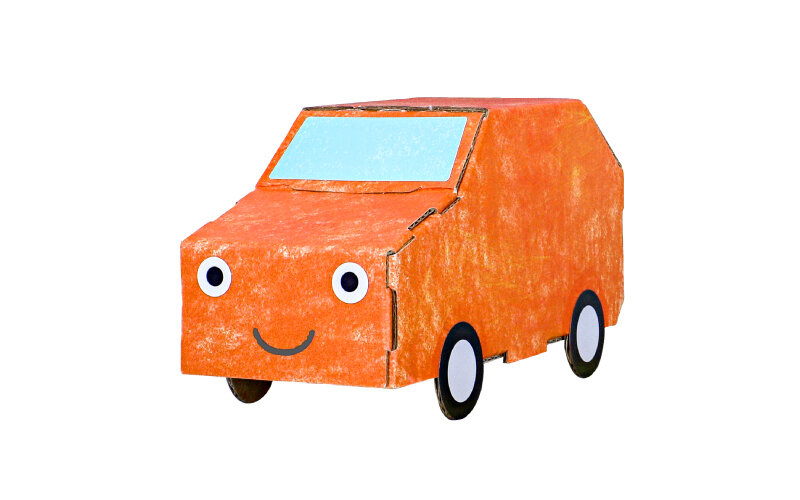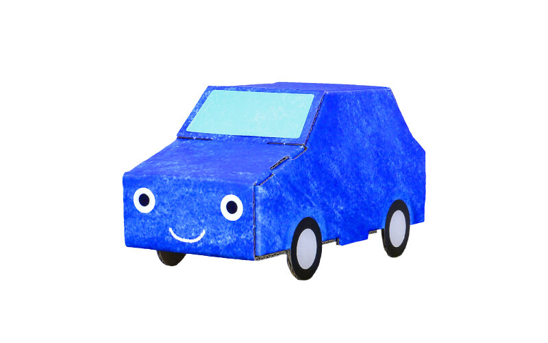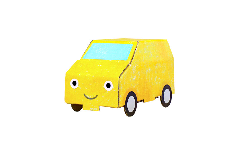 4台のくるまが作れるよ。ダンボールに好きな色を塗って、組み立てて、目のシールを貼って楽しもう!幼児におススメ!親子で作って楽しもう!